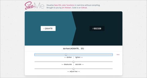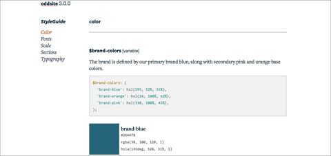 OddBird already had two brand colors, so I used another favorite tool to expand our color palette and find colors that would look great with our brand colors. Because we write our style sheets in Sass, SassMe was the perfect tool for creating our palette. I entered OddBird’s dark blue and used the sliders to find a very dark color for the text and a very light “callout” background color for highlighting important information. SassMe converts the hex colors into Sass color functions for me.