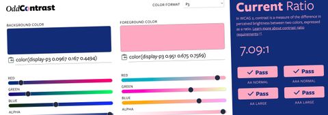 OddContrast, OddBird’s color format converter and contrast checker, gets new features – including the ability to swap background and foreground colors, and display color gamut ranges on the color sliders. Contrast ratios now incorporate foreground color alpha values.